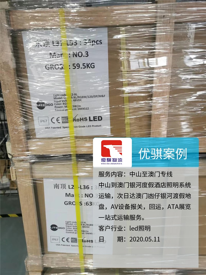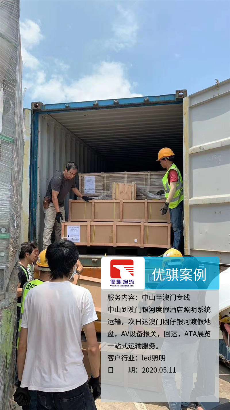 業(yè)務內容:中山到澳門銀河度假酒店照明系統(tǒng)運輸,次日達澳門凼仔銀河渡假地盤,AV設備報關,回運,ATA展覽一站式運輸服務。客戶行業(yè):LED照明客戶來源:老客戶介紹自從我們中山優(yōu)騏物流開通了中山至澳門的物流專線以后,很多原來物流的同行都介紹業(yè)務過來。這個客戶是從中山發(fā)燈具到澳門,整個AV設備報關,回運,ATA展覽都是我們完成,獲得了客戶的一致好評,期待下一次的合作。